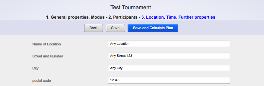 Help > Your first Tournament in just Five Minutes > Set location, time and additional settings