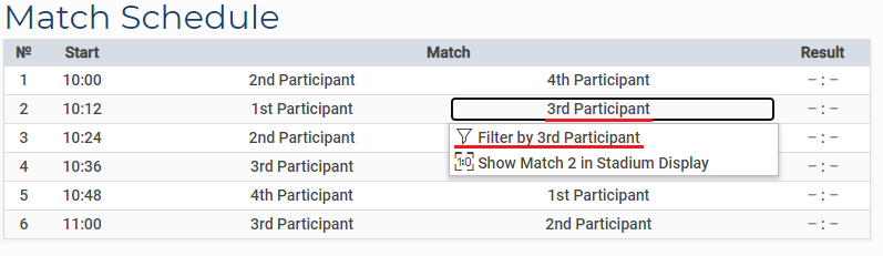 You can choose what you want to be displayed under Group, Matchdays and Match number. Here, you can pick a group or matchday (groups can only be picked when there is a group phase in the tournament, matchdays can only be picked within leagues). You can also filter for participants but beware that when you select one participant the selection of a group will be ignored. Filtering for matchdays will ignore the filter for participants.